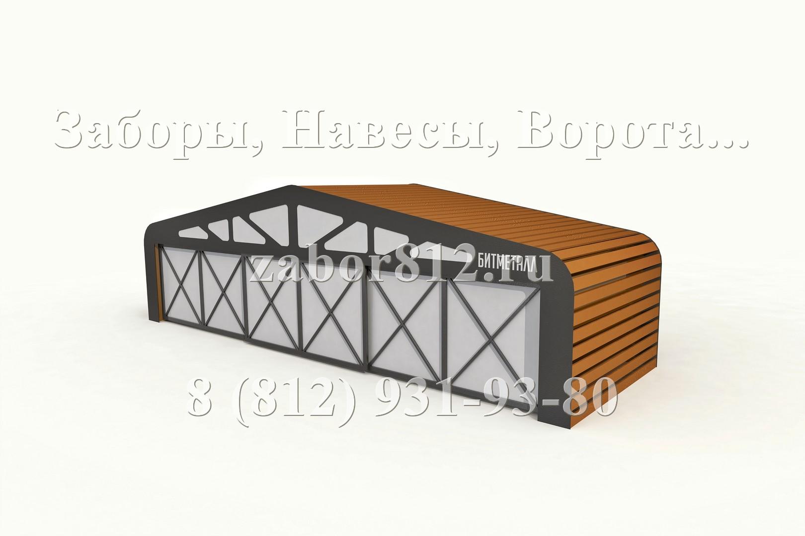 Вариант на фото имеет размер 8 х 2 метра и максимальной высоты 2 метра. Служит для хранения хозяйственного инвентаря, контейнеров для раздельного сбора мусора, мототехники. Данная постройка имеет самодостаточный внешний вид и гармонично смотрится как в качестве отдельно-стоящей постройки, так и пристроенной к стене дома, гаража и пр.