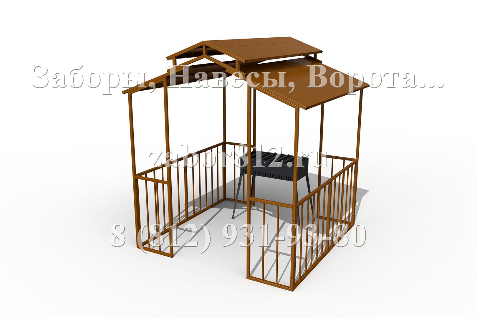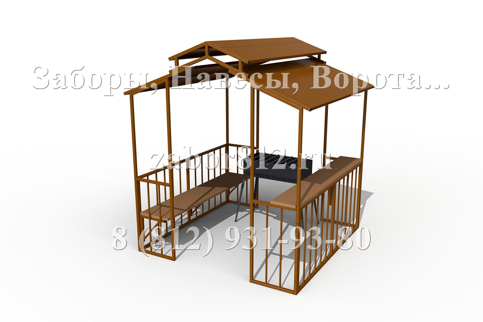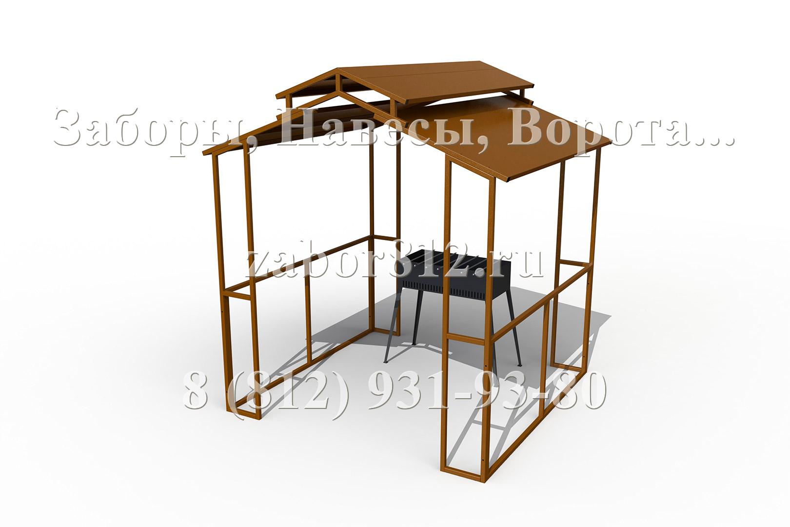 Базовый вариант навеса над мангалом (барбекю) состоит из стоек, боковых рам-перемычек и крыши. Все основные элементы конструкции изготовлены из профильной трубы и листового металла. Навес окрашен порошковой полимерной атмосферостойкой краской. Дополнительные опции в виде столешницы, полок и скамьи имеют в своей основе мебельный щит из натурального дерева и обработанный защитно-декоративным покрытием. Крепеж используется стандартный - оцинкованный. Открытые торцы труб закрыты пластиковыми торцевыми заглушками.